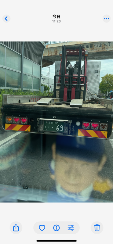 【いかつい車体に似合わぬ・・・】 環状2号線を走行し信号待ちで何気に前をみたら、フォークリフトを載せている工事現場作業用のいかつい車でした。でもそのいかつい風貌に似合わない可愛いテールランプがついていたので、思わず写真を撮りました。アンバランスな魅力です(笑)。