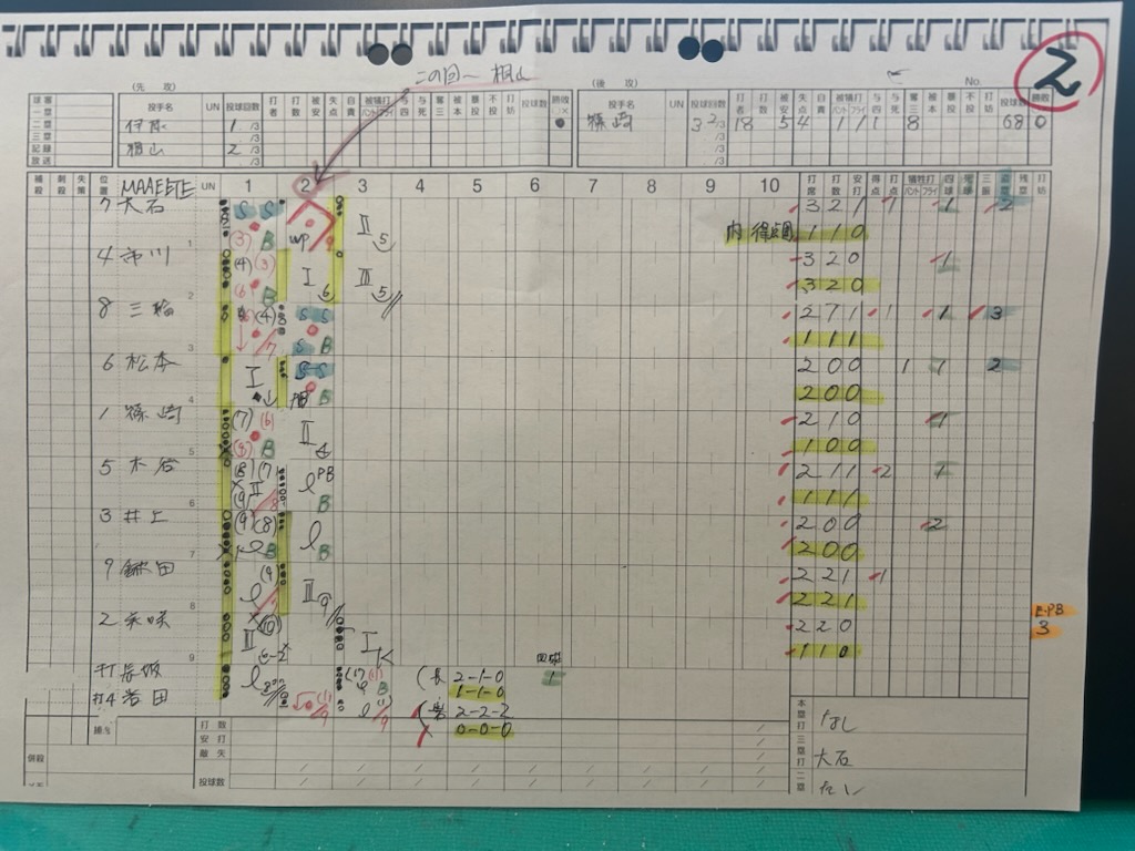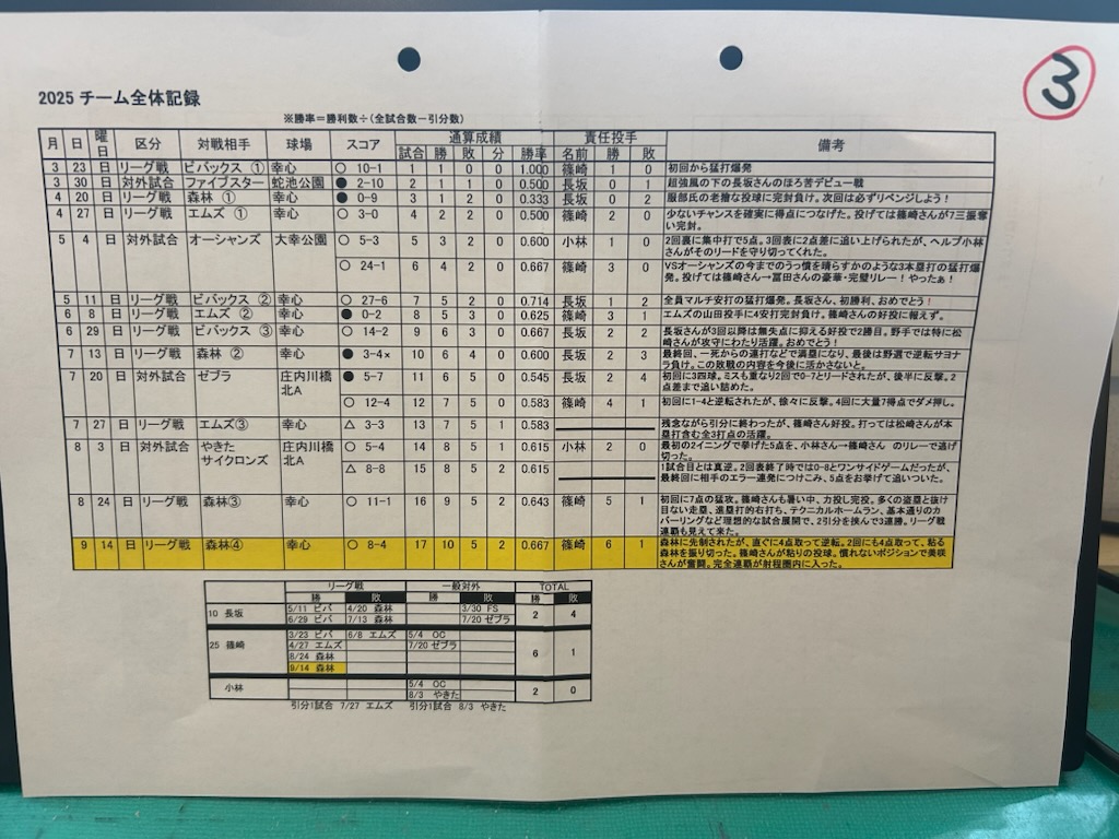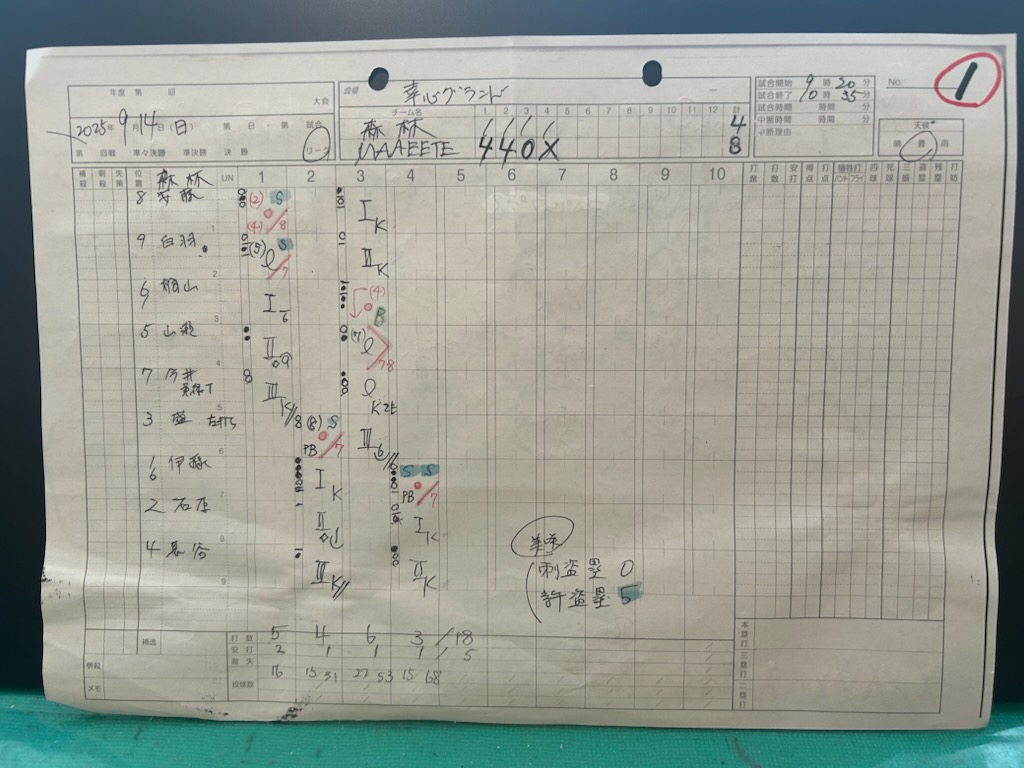 堀場が監督を務めますソフトボールチーム「MAAEETE」。何と、連覇へマジック2となりました。昨日の午前中、2位の「森林」と戦い8×-4で撃破。試合内容はこの通りです(画像①は対戦相手の「森林」のスコアシート。画像②は「MAAEETE」のスコアシート)。