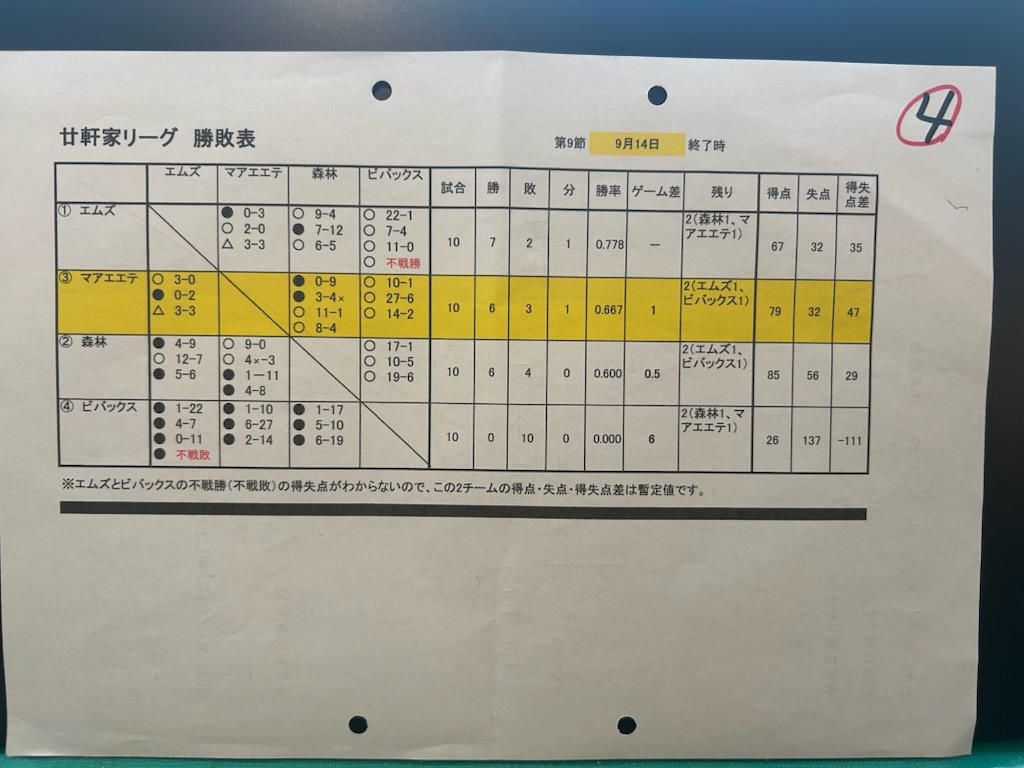 これでトータルとしては10勝5敗。2引分を挟んで4連勝(画像③)。リーグ戦も2位になりました(画像④)。残り試合は2。9月28日(日)か10月12日(日)のどちらかで行われる対エムズに勝利すれば、ぐ~っと連覇の可能性は高まります。もしも連覇したら、昨年優勝時に自粛した胴上げを、今年はしてもらうつもりです。是非、応援の程宜しくお願い致します。