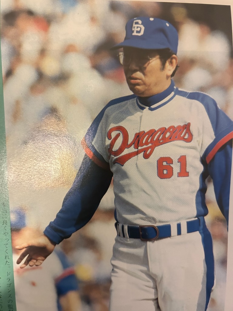 その後、一度はCBCで野球解説者となりましたが、1981(S56)年から監督として現場復帰しました。今度は「一芸に秀でた選手を起用する」と宣言し、各自に自分の長所を伸ばすことを要求し、「アメフト野球」「ツープラトン野球」なるものを強く推し進めました。これは、試合の序盤~中盤は打力に秀でた攻撃的な選手を起用(オフェンス)し、リードしたら守りに秀でた選手を起用し逃げ切る(ディフェンス)という内容です。1年目の春先はこれが面白いように的中し、首位戦線をかき回しました。しかし徐々に失速。最終的には5位に終わりましたが、対巨人戦には12勝11敗3分と勝ち越し、巨人の完全優勝を阻止しました。これは痛快でした。
