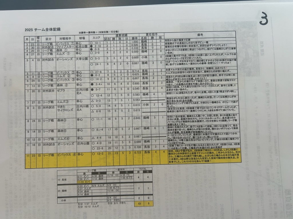リーグ戦に於いて我々は最終戦の前まで6勝3敗2分の2位。昨日23日(日)の最終戦の対戦相手はビバックス(第1試合)。ビバックスには見事12ー3で勝利。この時点で7勝3敗2分となり、2年連続の2位以上が確定しました。