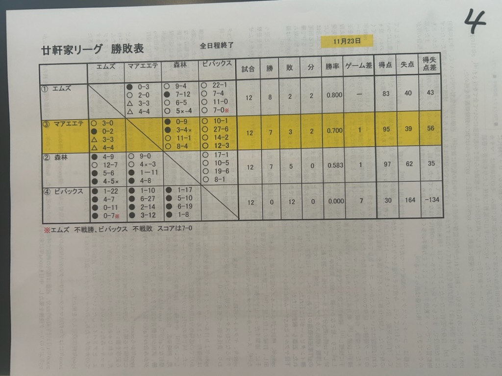 なので、マアエエテは2位でした。対エムズに2引分が痛かったですね。せめてどちらか1つは勝ちたかったですね。これは監督である自分の不徳の致すところです。大反省です。